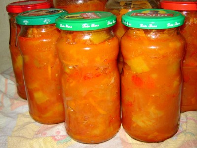 - El ajo machacado con una prensa se agrega a las verduras, se mezcla con vinagre, después de 5-6 minutos, la salsa se empaqueta en platos estériles, que se sellan.