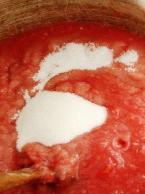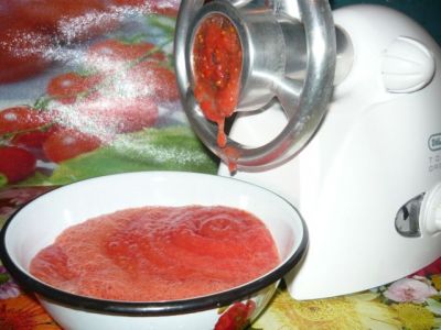 ¡Consejo! También es mejor quitar las semillas de los tomates. - Diluya la pasta de tomate en una proporción de 1: 2 agregando sal, azúcar, tomates picados.