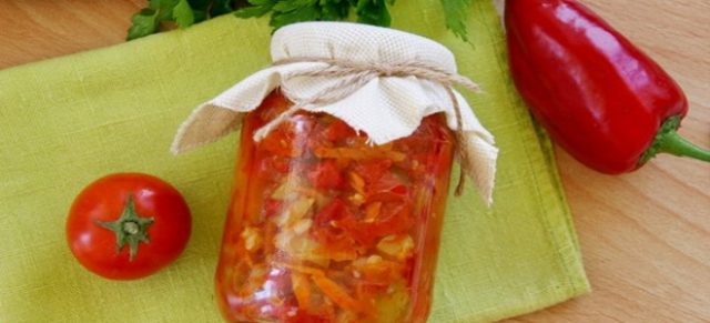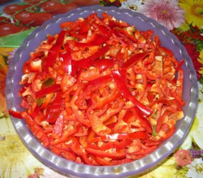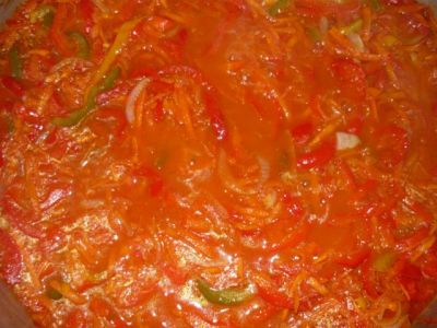 - Agregue los pimientos dulces, cortados en tiras anchas, la salsa y el jugo. Guisar hasta que la pimienta esté medio cocida, sazonar con sal. Colocados en platos estériles, esterilizados. Basta con dejar reposar frascos de un litro en un baño de agua durante 10 minutos y luego tapar.