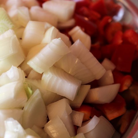 - Moler tomates para esta salsa es opcional, solo córtalos. Las cebollas y los pimientos morrones se cortan aún más grandes en 4 trozos.