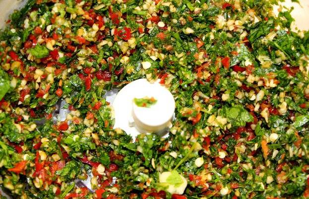 - Luego, los dientes de ajo preparados, las verduras lavadas y los pimientos picantes pelados se pasan por una picadora de carne. También puedes usar una licuadora. Se agregan diez gramos de sal y una cucharada de hierbas aromáticas secas a la mezcla resultante.