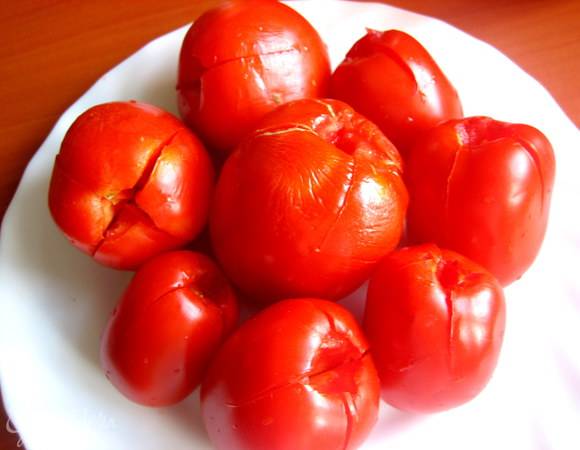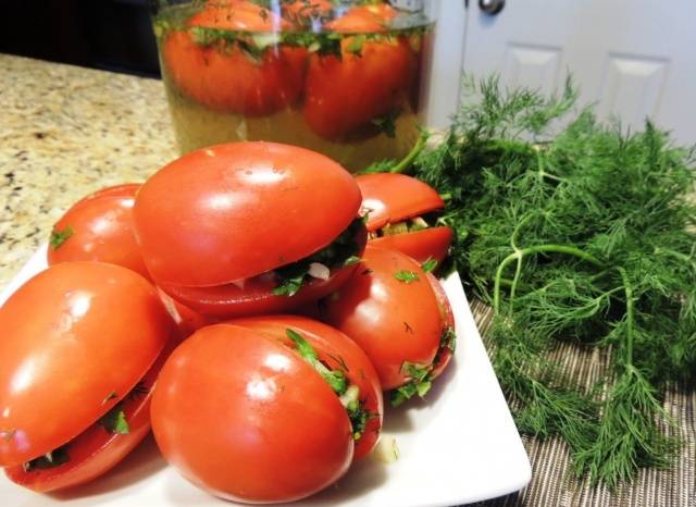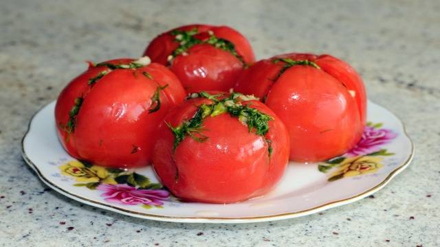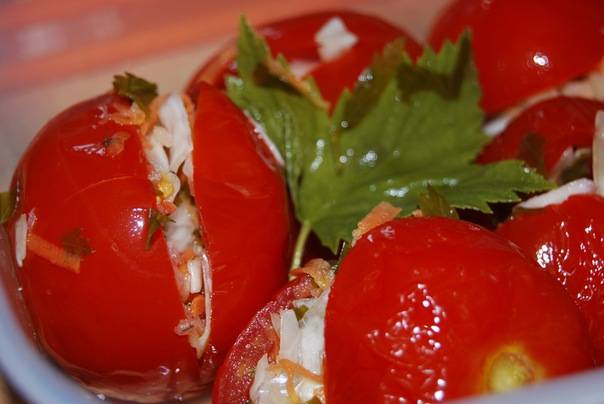 - Se lavan los tomates rojos pero ligeramente verdes y se hace una incisión cruciforme en la parte superior del fruto. Las incisiones no deben caer por debajo de la mitad de la fruta. A continuación, los tomates se rellenan con un relleno preparado de hierbas y pimienta con ajo.