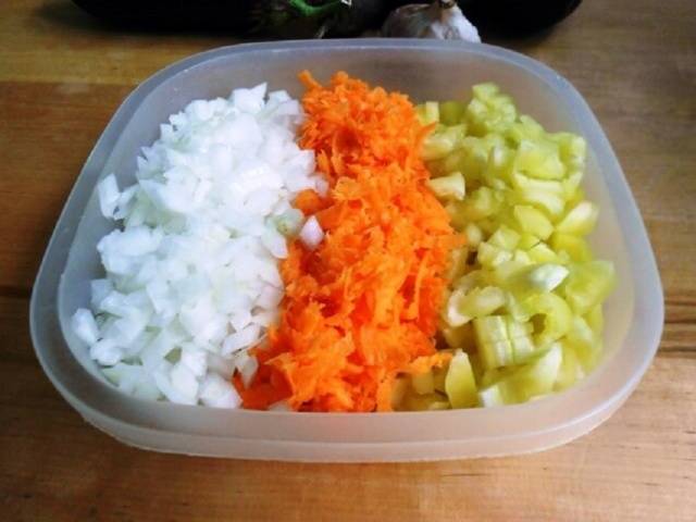 ¿Hornear, hervir o poner crudo en la sartén? Depende del gusto y la preferencia. Receta caviar con berenjena al horno prevé su procesamiento en el horno. Para hornear la verdura primero, debe lavarla, secarla, cubrirla con aceite de girasol y perforarla con un tenedor. Luego colocar en un horno precalentado y hornear hasta que estén tiernos.Verifique la preparación con un palillo de dientes. Si la berenjena se perfora fácilmente, entonces se puede usar más. El horneado dura aproximadamente una hora, dependiendo del tamaño y la edad de las verduras. El azul horneado se agrega al final al asar el caviar. Puedes hervir verduras en agua con sal. La preparación del azul al cocinar llega en 10 minutos. Retire las berenjenas para caviar del agua, enfríe. Luego retire la piel y corte en cubos medianos. Los cubos pequeños no funcionarán, simplemente se desmoronarán en nuestro caviar. La berenjena hervida también se agrega a la sartén después de todas las verduras.