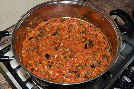Necesitarás 2 cacerolas para cocinar. Cocine a fuego lento las berenjenas en una hasta que estén blandas, agregue tomates y cocine a fuego lento durante otros 10 minutos. En otra sartén sofreír las cebollas y las zanahorias. La cebolla debe dorarse. Mezcle las verduras, sazone con sal y azúcar y cocine a fuego lento durante aproximadamente media hora.