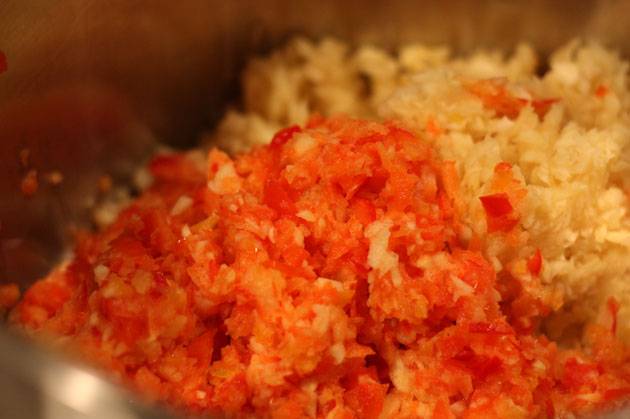 Lavamos y limpiamos las verduras, quitamos las semillas del pimiento, cortamos todo en trozos y lo torcemos con una picadora de carne. Obtendrá un puré bastante líquido. Viértelo en una cacerola de paredes gruesas y déjelo hervir. En esta etapa, agregue sal, azúcar y las especias necesarias a la mezcla de verduras. La mezcla ahora debe hervir a fuego lento durante unos 40 minutos. Durante este tiempo, se espesará.