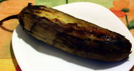 Hornee las berenjenas lavadas y secas en un horno calentado a 220 grados hasta que estén blandas.