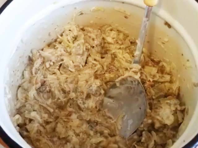 En un recipiente hondo, mezcle todas las verduras con ajo y hierbas y deje reposar durante otros 30 minutos. Luego se vierte aceite vegetal en el recipiente multicocina, se calienta y la mezcla de verduras se coloca encima. El modo de "extinción" se establece durante 10-15 minutos.