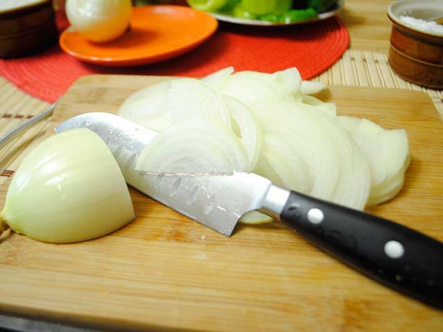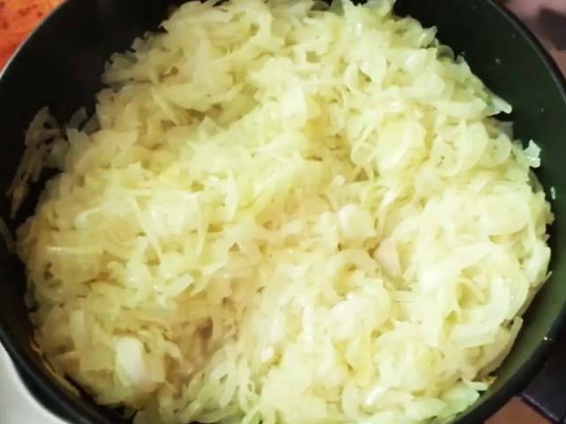 Al mismo tiempo, corta la cebolla en mitades finas y fríelo hasta que esté transparente durante unos 8-10 minutos. No permita que se doren las cebollas.