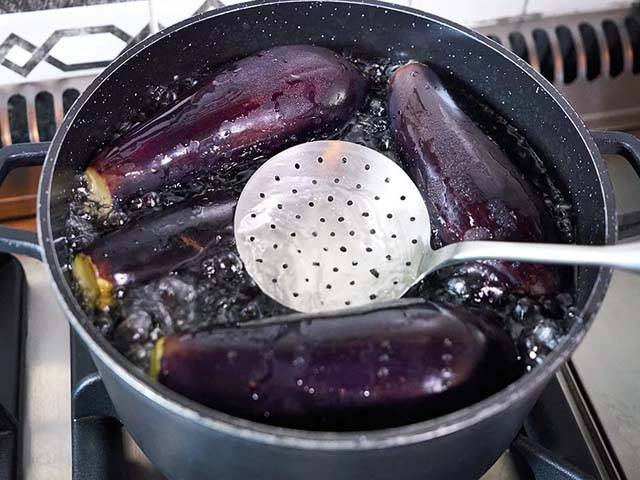También es importante que todas las piezas estén expuestas al mismo efecto uniforme de agua hirviendo, por lo tanto, durante el proceso de cocción, se deben mezclar con mucho cuidado, intercambiando las inferiores por las superiores.Si no tiene una cacerola lo suficientemente grande para hacer esto de manera ordenada, cocine la berenjena en varias porciones.