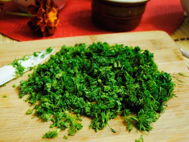 El eneldo y el perejil también se cortan con un cuchillo, mientras que según la receta para hacer berenjenas "debajo de los champiñones", no se recomienda dejar tallos duros cerca de las hojas.