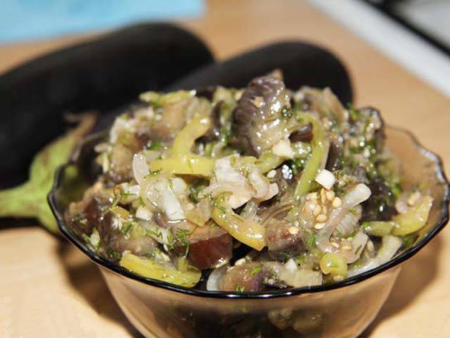 En la siguiente etapa, los cubos de berenjena se colocan en la marinada y se hierven durante al menos 5 minutos. Después de eso, el líquido se escurre con cuidado y la berenjena con especias permanece en el fondo de la sartén. Se les agregan verduras picadas: cebollas, ajo y hierbas. Por último, todo se vierte con aceite vegetal y se mezcla bien.