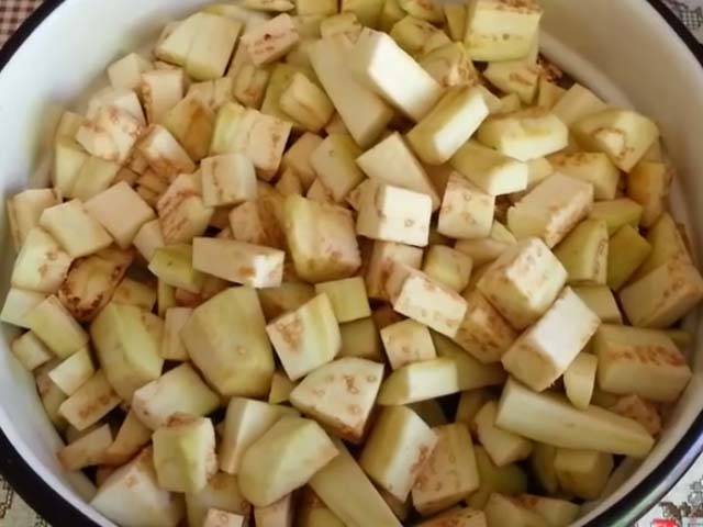 Se permiten berenjenas grandes en esta receta. Solo que necesariamente se pelan y luego se cortan en trozos, de unos 2x2 cm de tamaño, se colocan las verduras picadas en una cacerola con agua fría, se lleva a ebullición y, revolviendo suavemente, se cocina durante 8-10 minutos.