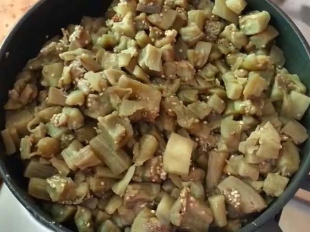 Las berenjenas, después de enfriarse por completo, también deben cortarse en cubos no gruesos. Pueden quedar manchas de sal en algunos lugares de la piel.