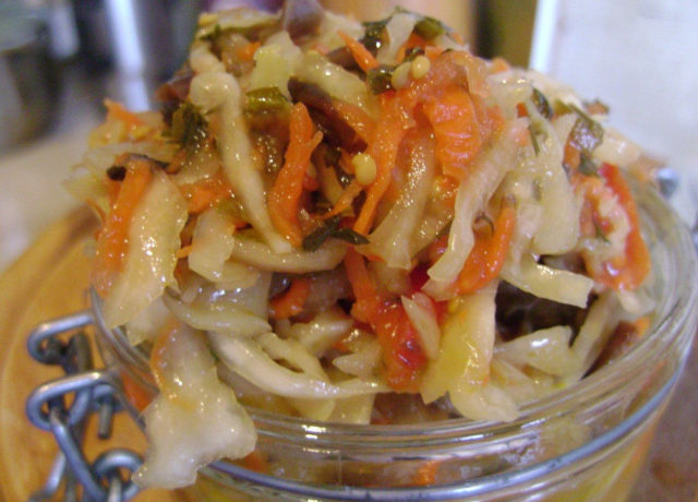 - Coloque la ensalada terminada en frascos, agregue los granos de pimienta, enrolle y envuelva algo tibio.