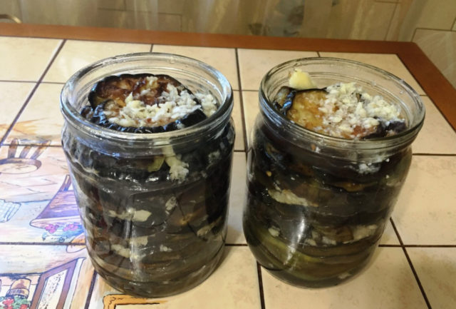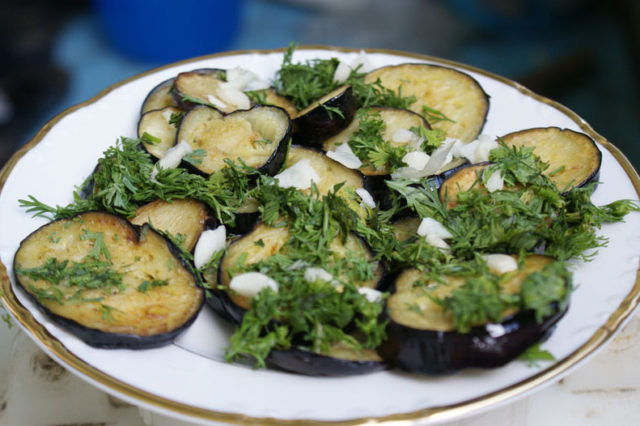 Puedes probar la merienda al día siguiente. Para el almacenamiento, las berenjenas, fritas para el invierno con perejil y ajo, se reorganizan en un lugar fresco.