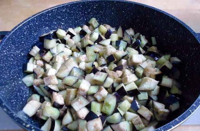 Cortar las berenjenas remojadas y exprimidas en rodajas y freírlas en un poco de aceite en una sartén de fondo grueso. Los azules deben estar dorados. Freír las berenjenas en porciones.