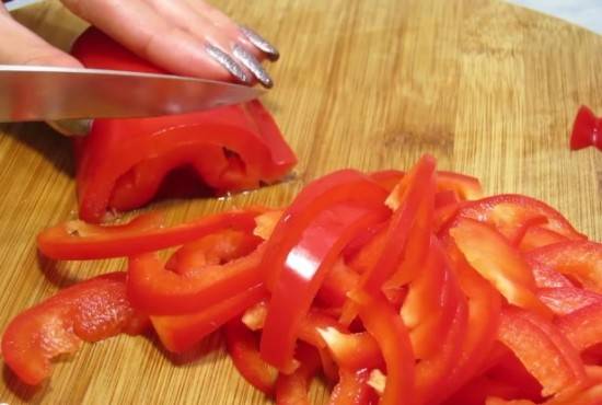 Retire las colas, semillas y particiones de los pimientos. Los cortamos en tiras. Llamamos su atención sobre el trabajo con pimiento picante: se corta con guantes. De lo contrario, no se pueden evitar las quemaduras en las manos.