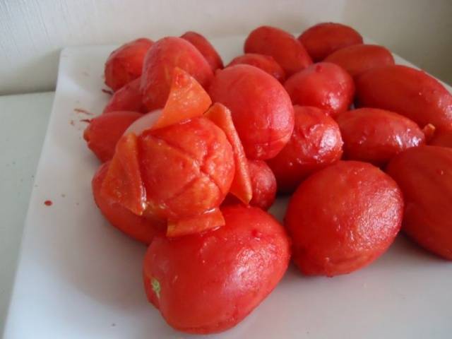 - Ponga los azules picados en una taza de agua salada (2 cucharadas grandes de sal por vaso de agua), encima - un poco de opresión para que todos los trozos queden en el agua. Después de 40 minutos, enjuague. Vertemos los tomates con agua hirviendo durante un minuto y medio, tras lo cual sacamos y limpiamos.
