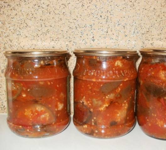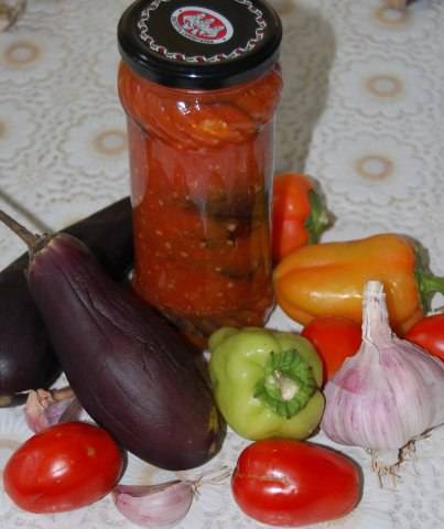 La combinación de berenjenas con tomates, pimientos picantes y ajo agrega especias y sofisticación al aperitivo. es más chile y el ajo se puede añadir en cualquier cantidad, por supuesto, razonable, dependiendo del sabor. Los azules se sirven en adjika, tanto fríos como calientes. Además, puede ser un plato aparte o servir como guarnición para platos de pasta, patatas, pescado y carne.