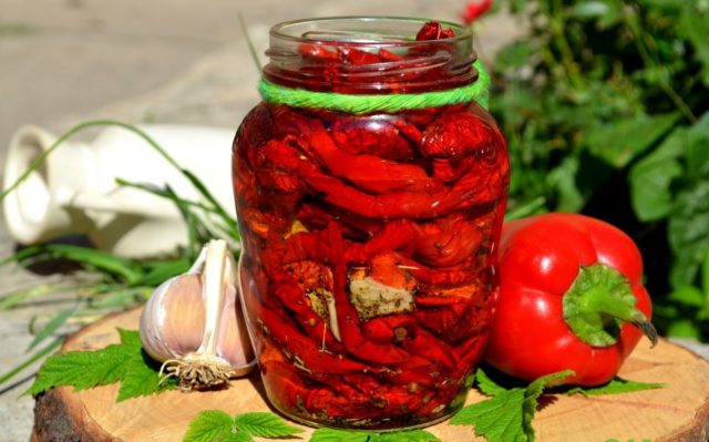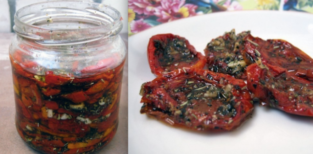- Coloque las verduras secadas al sol en frascos, vierta aceite caliente por encima.