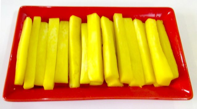 - Pelar las verduras bien lavadas, cortarlas en barras, espolvorear un poco de sal para quitarles el amargor y secar.