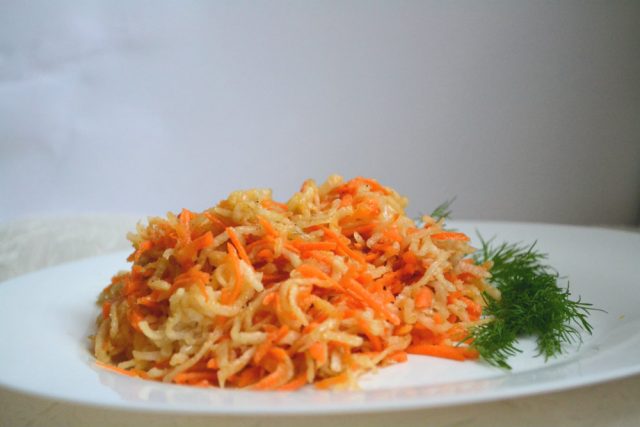 Entre las recetas de daikon con zanahorias para el invierno, la ensalada con la adición de ajo es la más popular.