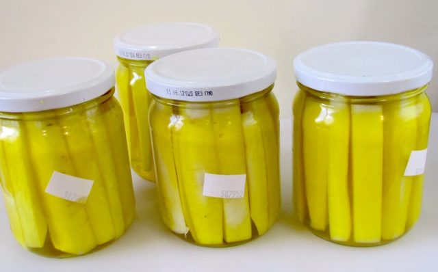 - Las verduras con adobo se colocan en frascos de vidrio y se colocan en agua hirviendo durante 15 minutos.