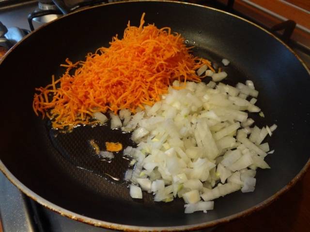 - Las cebollas y las zanahorias se fríen en una sartén con la adición de aceite de girasol.