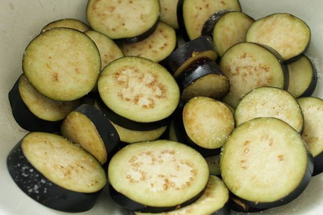 - Berenjenas (10 uds.) Cortar en cubos y cubrir con sal. En este estado, las verduras se dejan media hora para que salga el jugo. Esto eliminará el amargor que suele estar presente en estos vegetales.