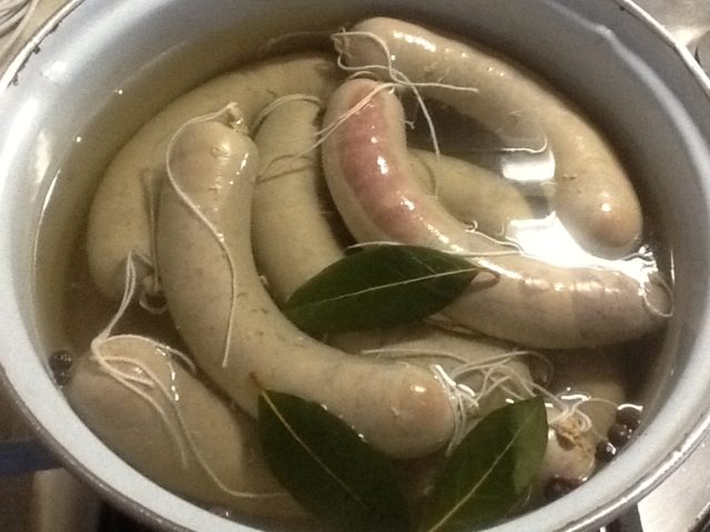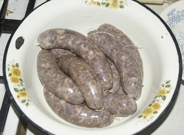 - Llene las tripas preparadas, perfore, ate bien los extremos y hierva durante media hora a 85 ° C.
