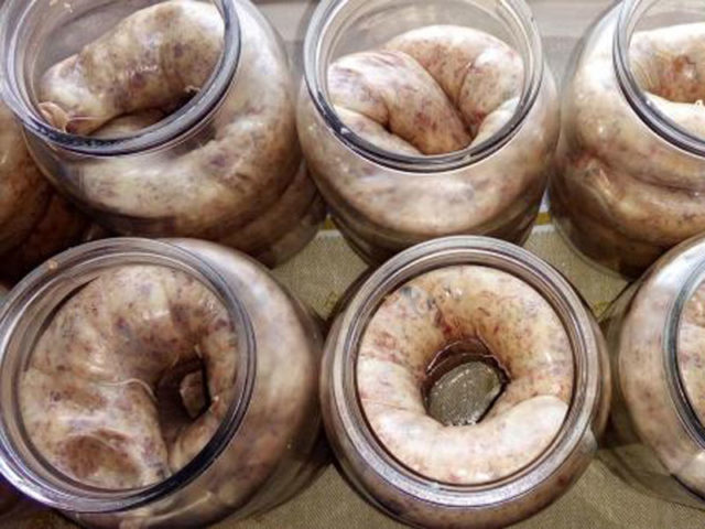 - Luego, puede enrollar el frasco y enviarlo para su almacenamiento en una cámara fría. Si tiene la intención de comer de inmediato, debe cortar la salchicha en un frasco y sacudirla en partes.