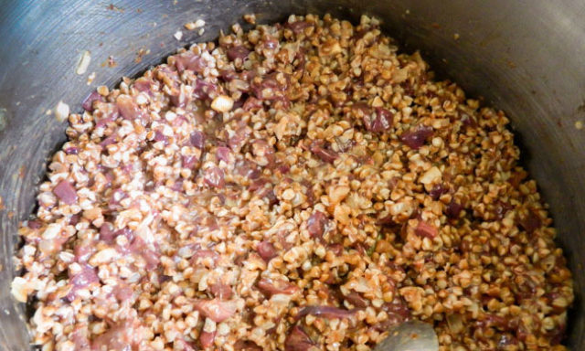 - Hervir el trigo sarraceno hasta que esté cocido en agua con sal y combinar con la carne picada. Agregue sal, nuez moscada, pimentón, pimienta negra y revuelva.