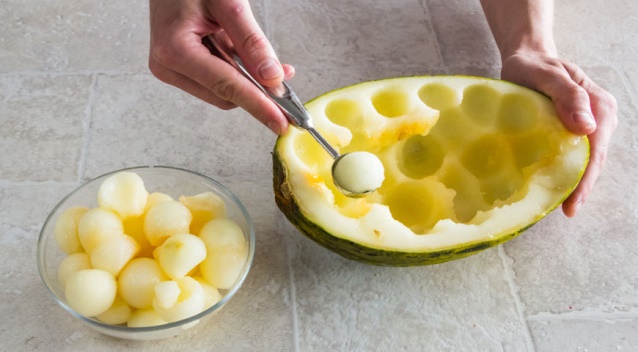 El melón para la receta se puede cortar en bolas con una cuchara especial. Este postre se ve más espectacular que cuando se corta en cubos.