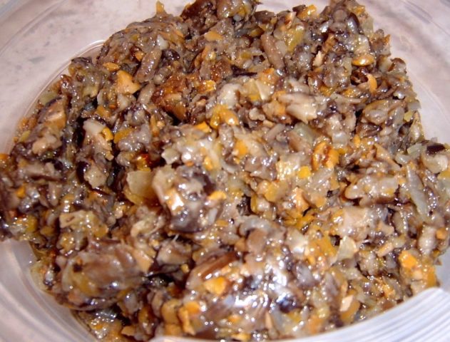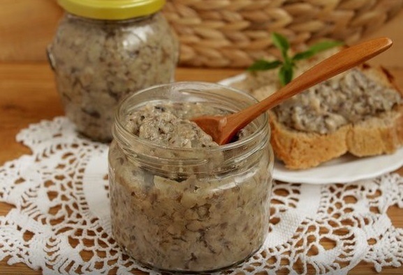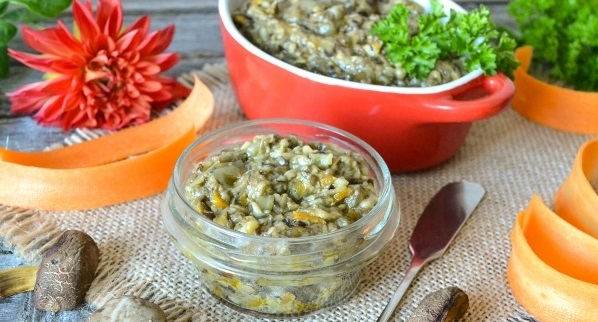 El caviar de setas para el invierno según la receta clásica "Lame los dedos" resulta homogéneo y sabroso. Se unta en bocadillos y se sirve como guarnición para platos de carne, patatas y cereales.