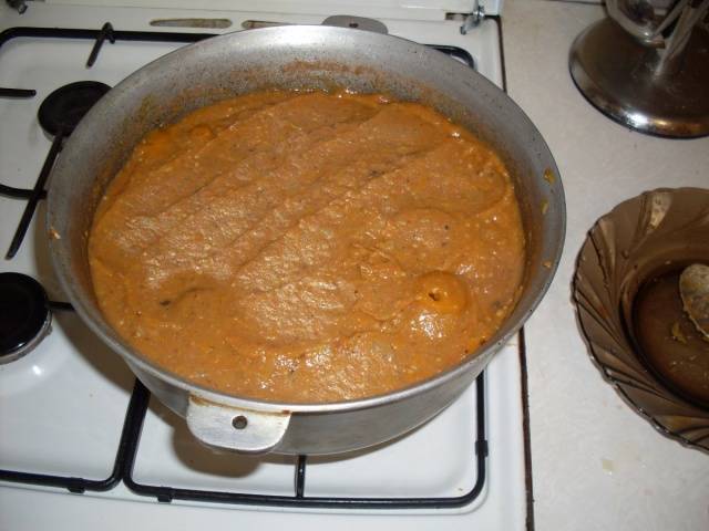- Agregue la pasta de tomate a los productos principales, cocine a fuego lento la mezcla de verduras durante 20-25 minutos hasta que esté completamente cocido.