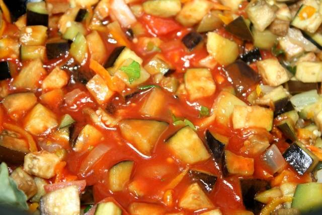 - Primero sofreír la cebolla en una sartén, luego agregar las zanahorias. El siguiente ingrediente para freír es la berenjena. Con el tiempo, agregue una pajita de dos pimientos, sal y azúcar a la mezcla de verduras.
