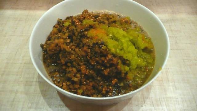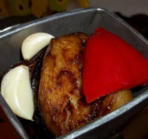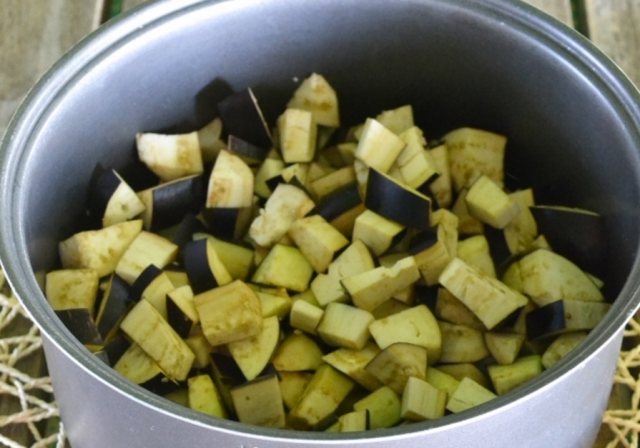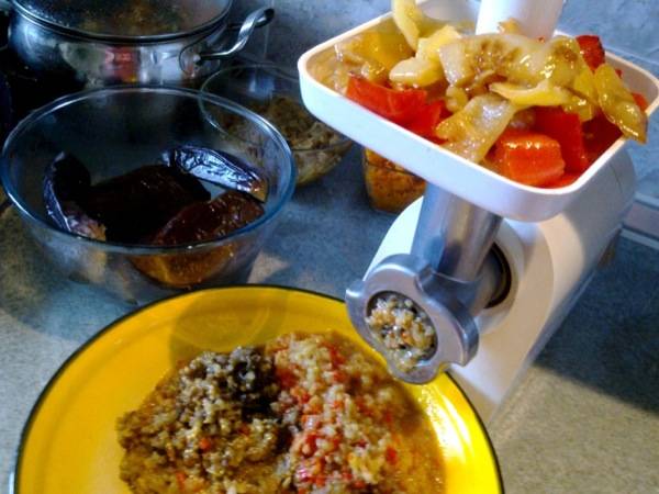 Luego se vierte aceite en una sartén, se calcina hasta que aparece una bruma apenas perceptible y se colocan allí berenjenas picadas y ligeramente exprimidas. Después de que se fríen, se pasan a través de una picadora de carne y se doblan en un caldero grande con un fondo grueso. Los pimientos se fríen por separado en la misma sartén, luego también se pasan por una picadora de carne y se agregan a la berenjena. Las cebollas se pasan primero a través de una picadora de carne y solo luego se fríen y también se agregan a las verduras.