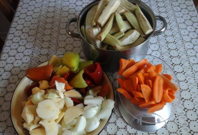 La pimienta y la berenjena deben cortarse en trozos largos a lo largo, agregar sal y dejar reposar durante varias horas.