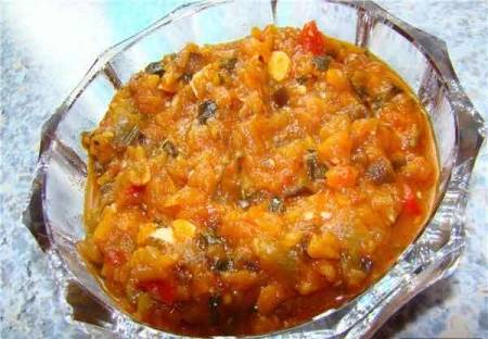 Pelar las verduras ligeramente frías y cortarlas en trozos pequeños. Todas las demás verduras no se cocinan. Se cortan en trozos pequeños, se mezclan con berenjenas, hierbas picadas, ajo, se sala, si es necesario, pimienta y se sazona con aceite vegetal.