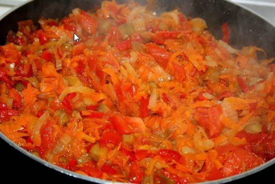Ponemos el caldero al fuego, calentamos todo el aceite y echamos la cebolla. Freír hasta que la cebolla esté dorada. Ahora le toca el turno al pimiento dulce, que le añadimos a la cebolla. Debe freír todo durante unos 10 minutos, revolviendo varias veces. Ponemos las berenjenas en un caldero con verduras.