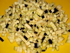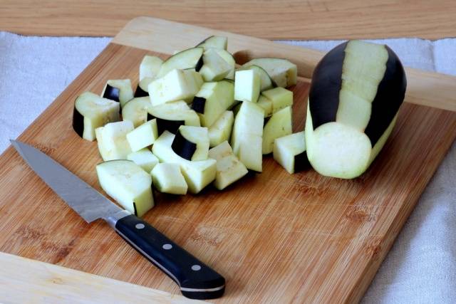Todas las verduras se lavan a fondo. Limpiamos los azules de la piel, cortamos en cubos de aproximadamente 1 cm, sal y dejamos durante media hora.