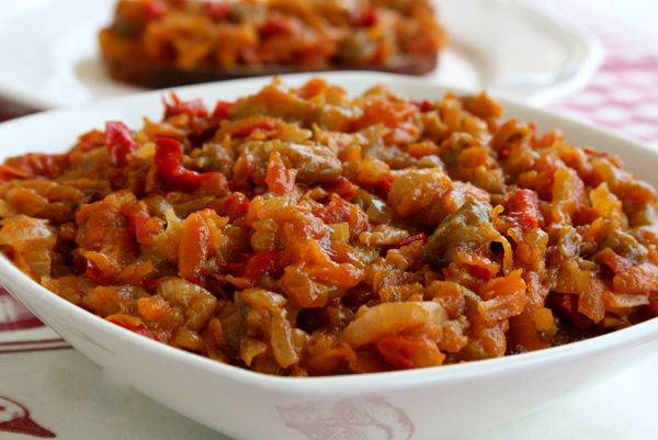 La combinación de verduras crudas y horneadas le da a este plato un sabor especial. Las vitaminas con este método de procesamiento se conservan casi por completo.Una pequeña cantidad de aceite vegetal y verduras bajas en calorías permiten que quienes quieran adelgazar utilicen este caviar.