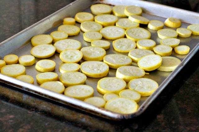 Precalienta el horno a 180 grados. Coloque el calabacín picado en una bandeja para hornear seca y hornee por 20 minutos. Sacamos el calabacín terminado del horno y lo trituramos con una licuadora o con una picadora de carne.