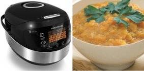 Corta el resto de las verduras en cubos, colócalas sobre la cebolla, sal, pimienta y enciende el modo pilaf, el tiempo de cocción es de unas 2,5 horas.