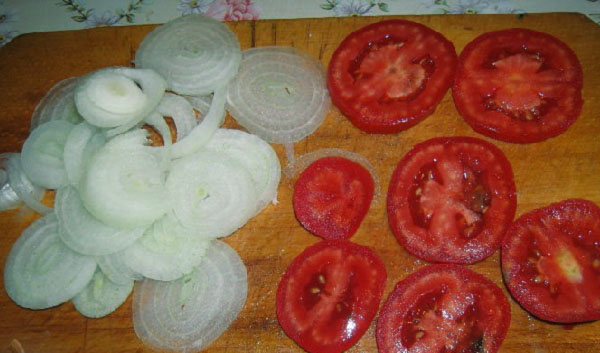 - Los tomates y las cebollas se cortan en aros, las zanahorias también se rallan en el mismo rallador.
