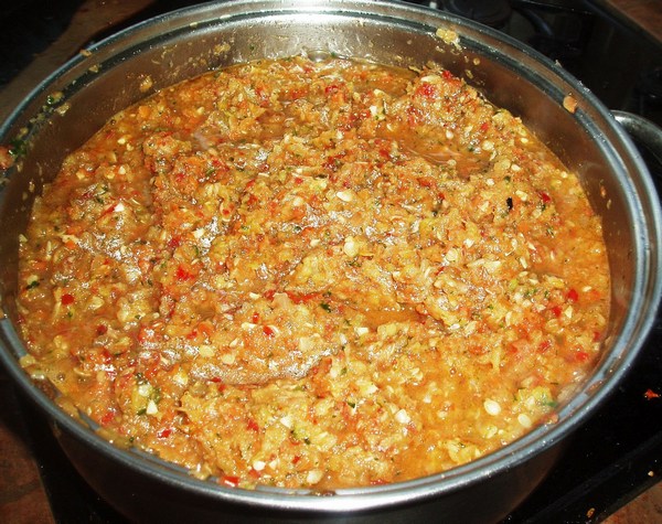 - Todas las verduras se colocan en un recipiente profundo con aceite, se calientan a ebullición a fuego alto, se reduce el fuego y se guisan hasta que estén cocidas durante aproximadamente una hora.