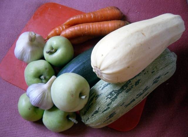 Basado en 2 kg de calabacín, necesitará 1 pimiento, 1 cebolla, 1 manzana verde, Ají picante (si es necesario, puede reemplazarlo con una cucharada de pimiento rojo molido), 1 zanahoria, pasta de tomate en la cantidad de 70 gy 1 cabeza pequeña de ajo. Además, además de los productos principales, debe abastecerse de conservantes como azúcar (1 cucharada), sal (50 g), aceite (1 cucharada) y vinagre al 9% (90-100 g). Se puede preparar un delicioso caviar mediante una combinación competente de este conjunto particular de productos.