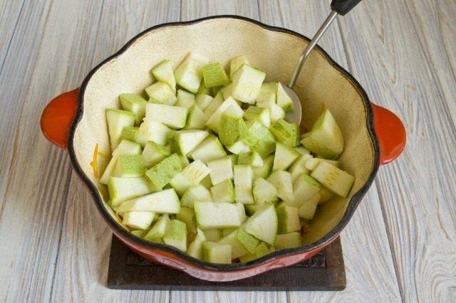 - Combine el calabacín con las cebollas fritas en un recipiente grande y cocine a fuego lento durante 90 minutos. No es necesario tapar el recipiente con una tapa, ya que el exceso de líquido debe evaporarse;