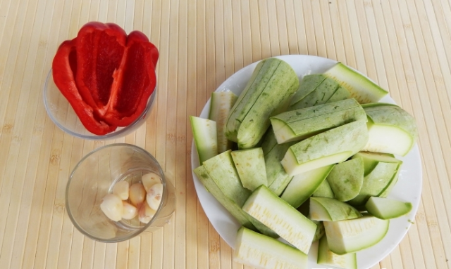 - preparar verduras: pelar y cortar el calabacín en trozos, picar las zanahorias en un rallador, picar la cebolla, quitar la piel de los tomates y picarlos y los pimientos morrones;