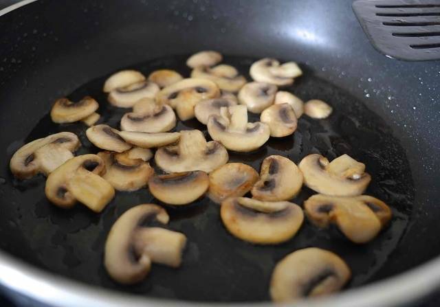 - Se cortan tres cabezas de cebolla en aros y también se corta medio kilo de champiñones.